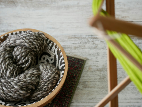 Die Schale ist mit zwei Löchern und einer spiralförmigen Öffnung graviert, durch die das Garn geführt werden kann, damit es während der Arbeit an Ort und Stelle bleibt. Dies verringert das Risiko, dass sich das Garn verheddert oder wegrollt.